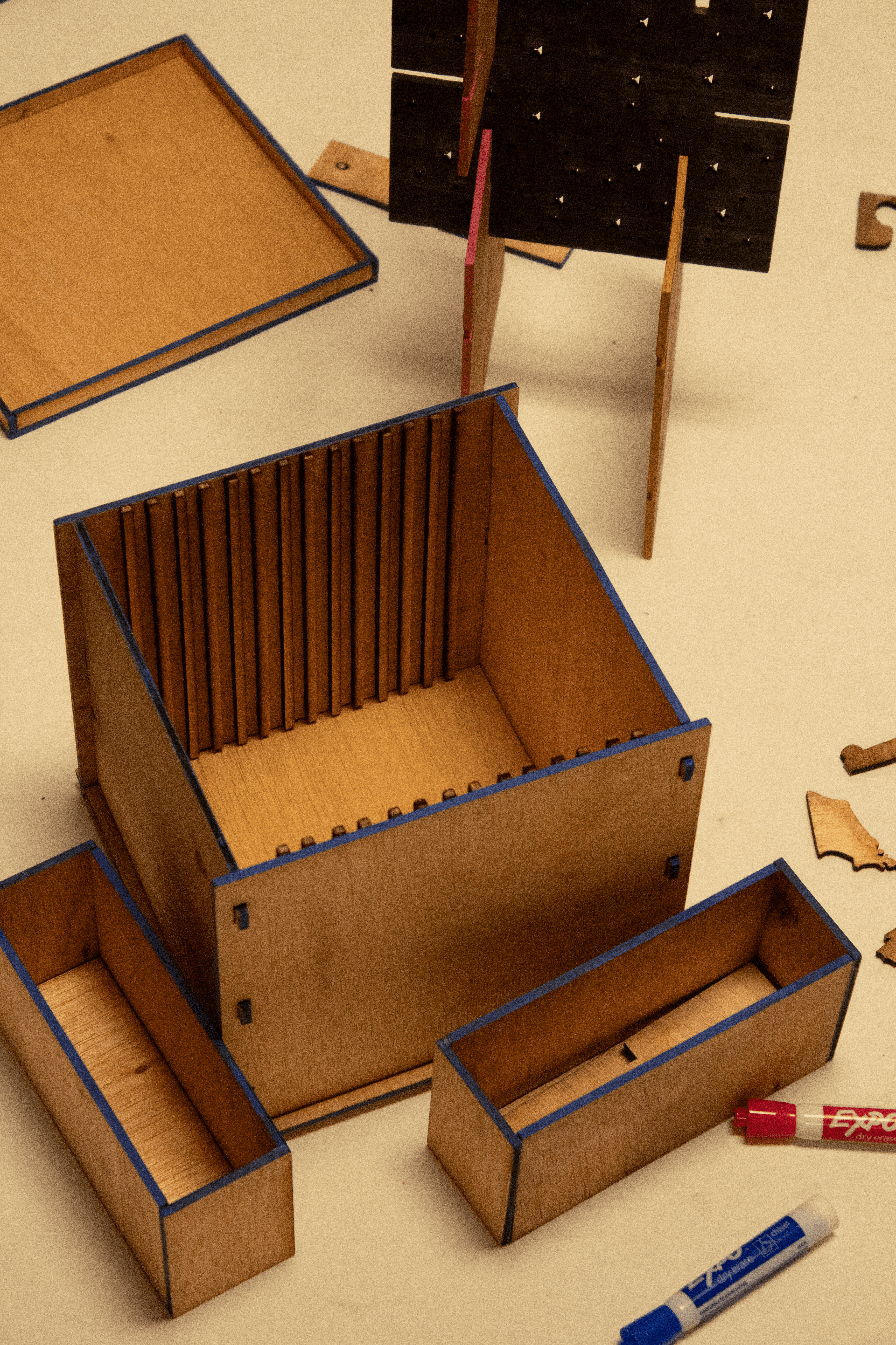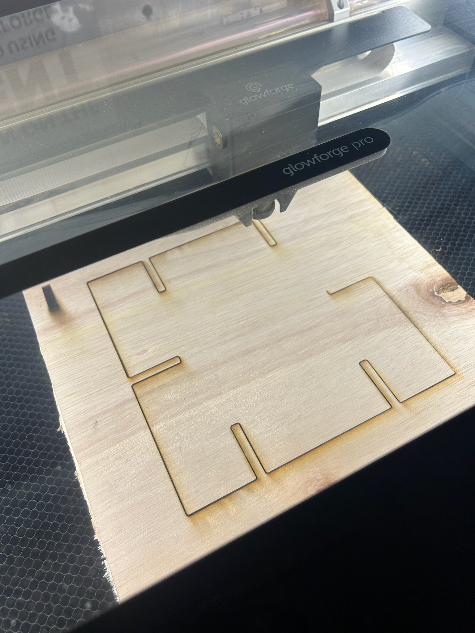 This project involved some trial and error and adapting to make it happen. We used the glow forge to cut our pieces but some of our pieces and Ideas didn't end up being possible, like cutting into the wood to create a slot so we added additional pieces of wood to outer wood to make the panels able to be slid into the cube.